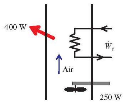 \dot{W}_{e, \text { in }}=(0.400 \mathrm{~kW})-(0.250 \mathrm{~kW})+(0.5 \mathrm{~kg} / \mathrm{s})\left(1.005 \mathrm{~kJ} / \mathrm{kg} \cdot{ }^{\circ} \mathrm{C}\right)\left(7^{\circ} \mathrm{C}\right)=\mathbf{3 . 6 7} \mathbf{~ k W}