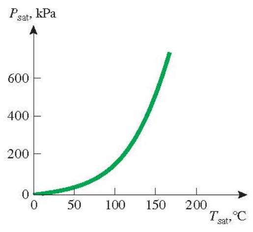 At a given pressure, the temperature at which a pure substance changes phase is called the saturation temperature (T{\text {sat }}). Likewise, at a given temperature, the pressure at which a pure substance changes phase is called the saturation pressure (P{\text {sat }}). At a pressure of 101.3 kPa , (T{\text {sat }}) is (100^{\circ} \mathrm{C}). Conversely, at a temperature of (100^{\circ} \mathrm{C}, P{\text {sat }}) is 101.3 kPa .